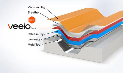 Veelo offers a complete composites debulking system. VeeloHEAT Caul is a lightweight heating solution that builds on existing debulk bagging procedures. Due to its uniquely flexible and pliable design, the durable and damage resistant caul is highly uniform across large surface areas and can easily accommodate custom shapes and large tools. It features an FKM-based heater system for high performance and material compatibility.